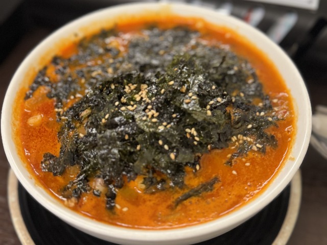 そして驚いたのが、表面が見えなくなるほどたっぷりとかかった韓国海苔。麺は韓国式うどんとも言われるカルグクス麺で、喉越しがとても良く、ツルツルと飲み込めます。
